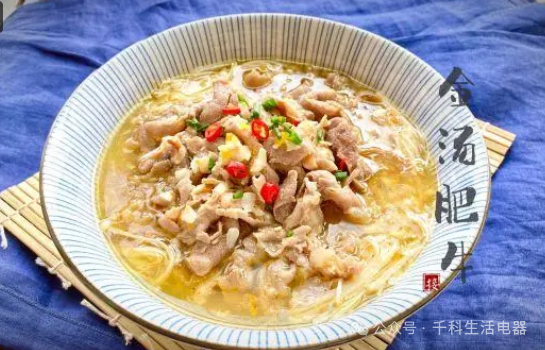 將準(zhǔn)備好的金湯倒入鍋中煮沸。加入牛肉片,加少許鹽和雞精調(diào)味。